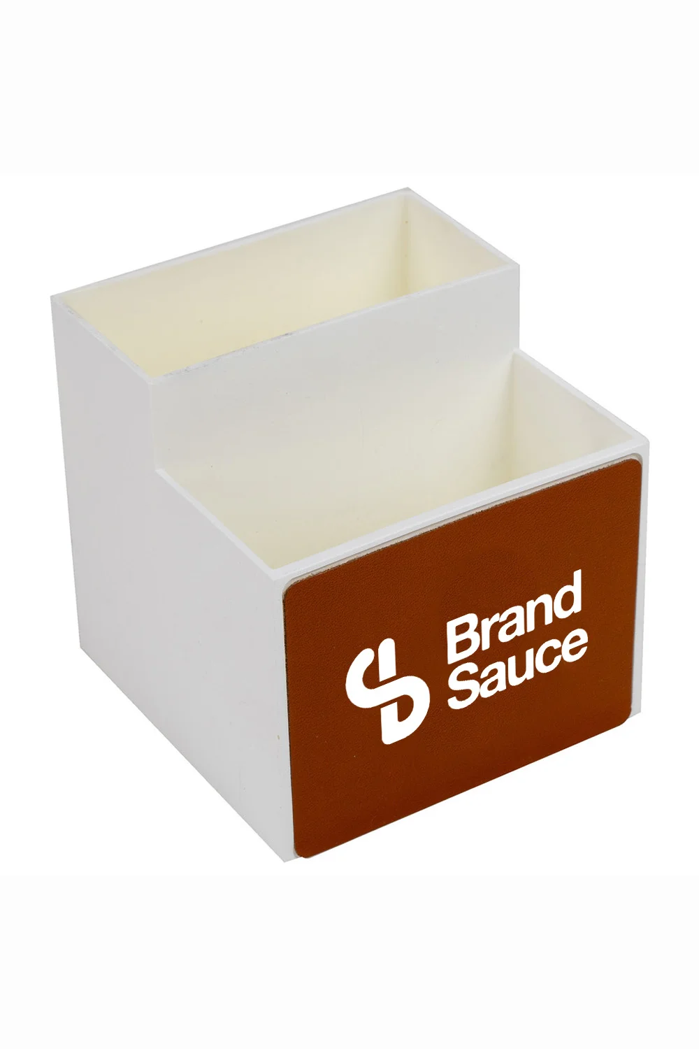 Introducing the TerraTone™ Desk Organizer! Made from recycled faux leather and plastic, this eco-conscious solution offers two compartments to keep your workspace tidy. With dimensions of 3.54 inches each, it’s perfect for organizing pens, paperclips, and more. Keep your desk tidy and help the planet with style!