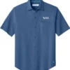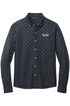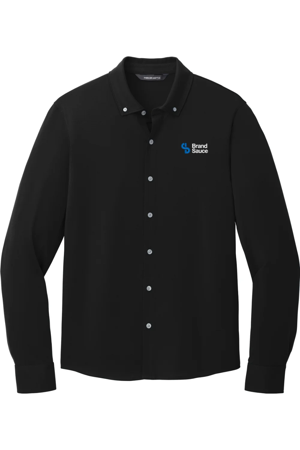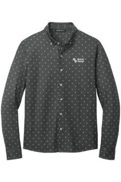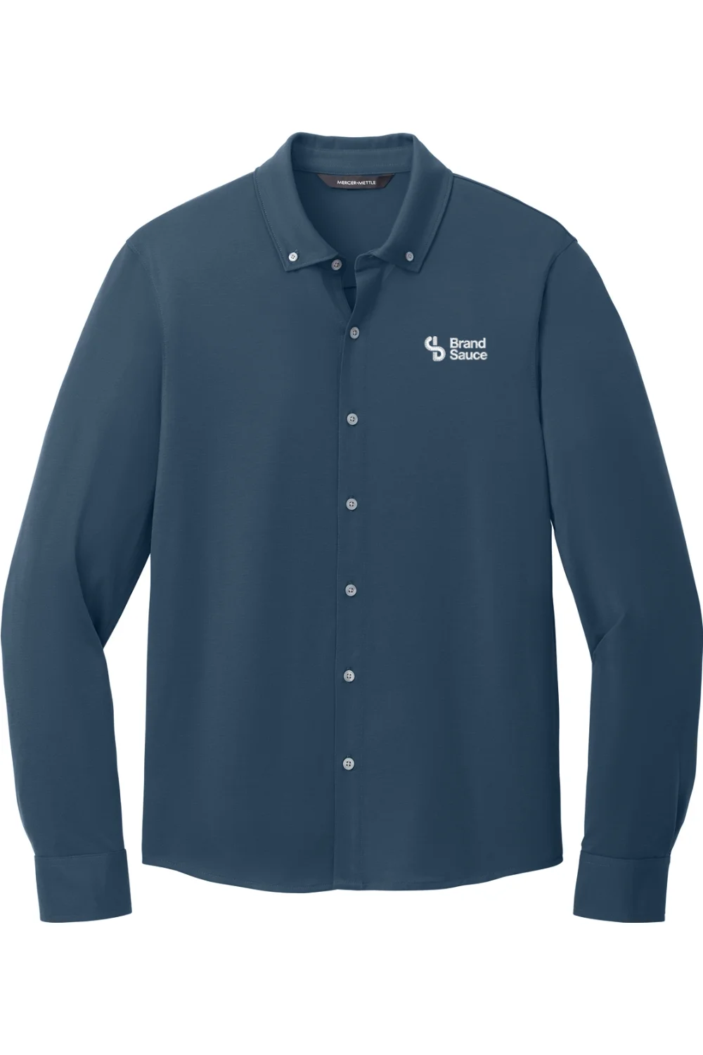 Elevate your office wardrobe with the Mercer+Mettle Stretch Jersey Long Sleeve Shirt. Combining traditional dress shirt components with soft jersey fabric, this modern hybrid silhouette offers all-day comfort and moisture-wicking properties. Features a button-down collar, EMB logo on the left chest, rimmed buttons, adjustable cuffs, and a curved shirt tail hem for a versatile and stylish look.